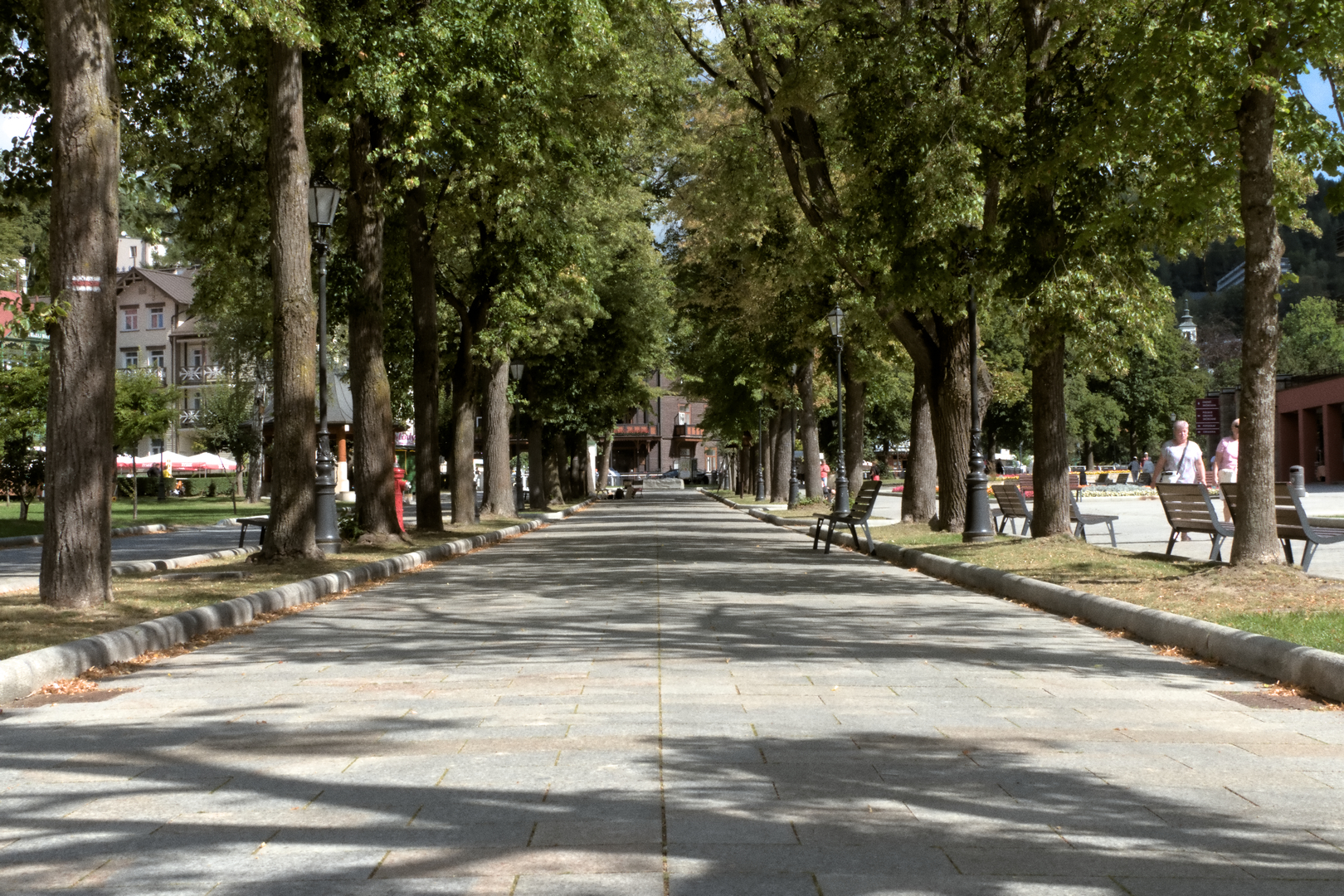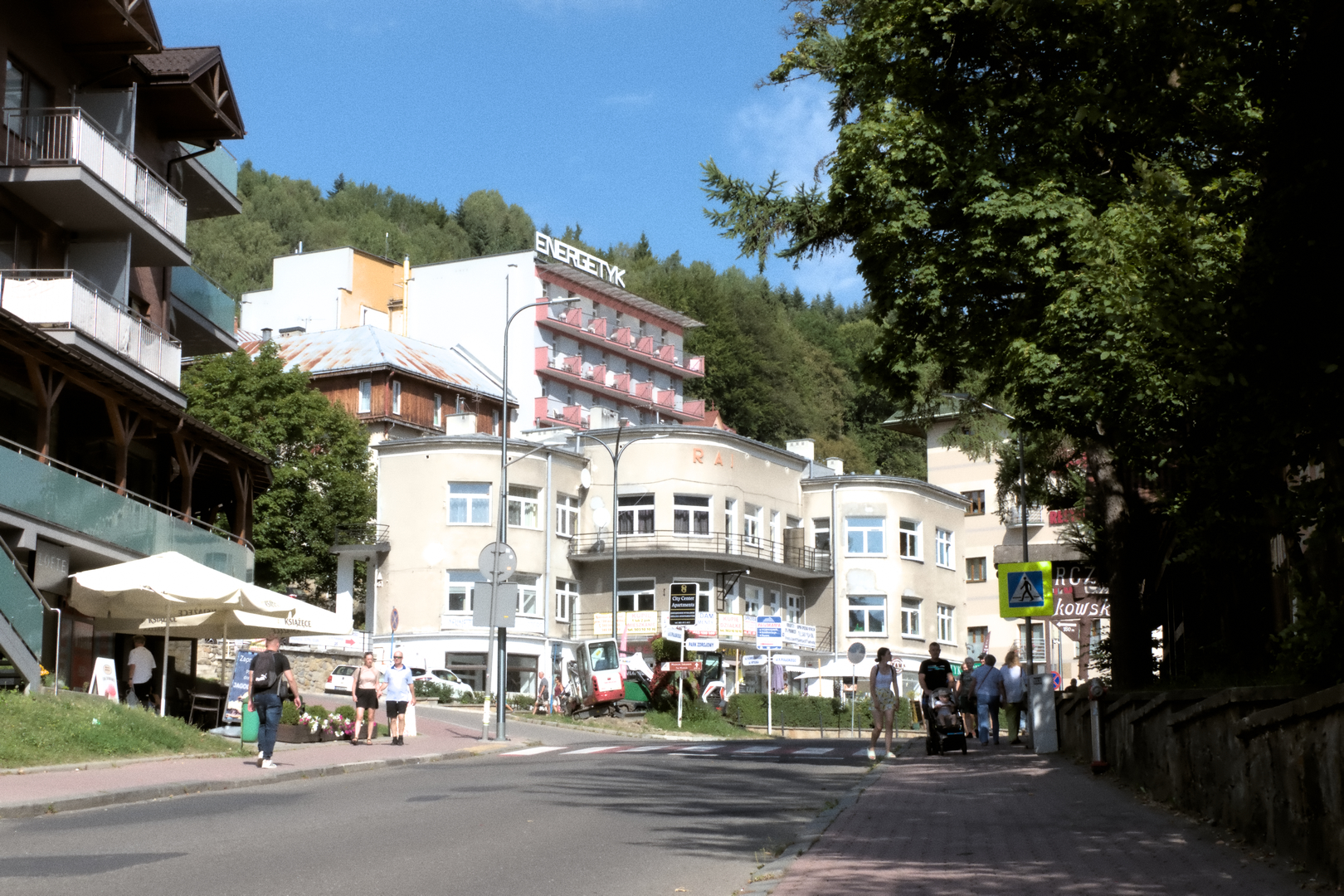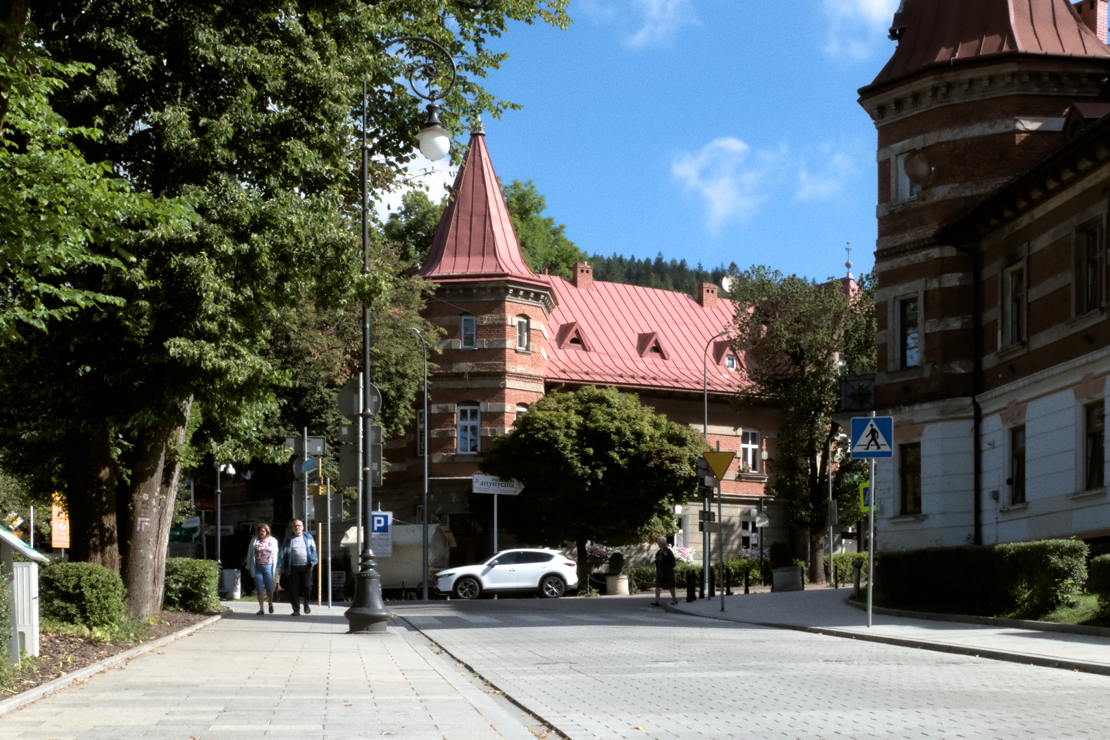 Krynica na każdym kroku zdaje się przypominać, skąd czerpie swoją tożsamość i do czego aspiruje. Jakby na moment zamknąć oczy, to rzeczywiście, czas w niektórych miejscach niewiele zmienił względem stanu rzeczy sprzed 100 lat temu i tylko detale nam przypominają jaki mamy rok. Na ogół jest to ciągłe wspominanie czasów świetności, czyli tego idyllicznego okresu międzywojnia. Od razu rzucają się w oczy wspaniałe, drewniane wille i murowane kamieniczki, ale jak okiem głębiej sięgnąć, można dopatrzyć się bardziej zapuszczonych budynków. Niektóre z nich mają ogłoszenia “na sprzedaż”. Pod warstwą pudru czuć, że nie każdy w Krynicy żyje dostatnie. Ale znów, łatwo poddać się atmosferze luzu i pozornej wytworności. Po chwili myślisz sobie, no jakbym się znalazł w tej II Rzeczypospolitej. Tu siedział Piłsudski, a tam spacerował Matejko. Czuć, że zachowała się tu pewną ciągłość historyczna.