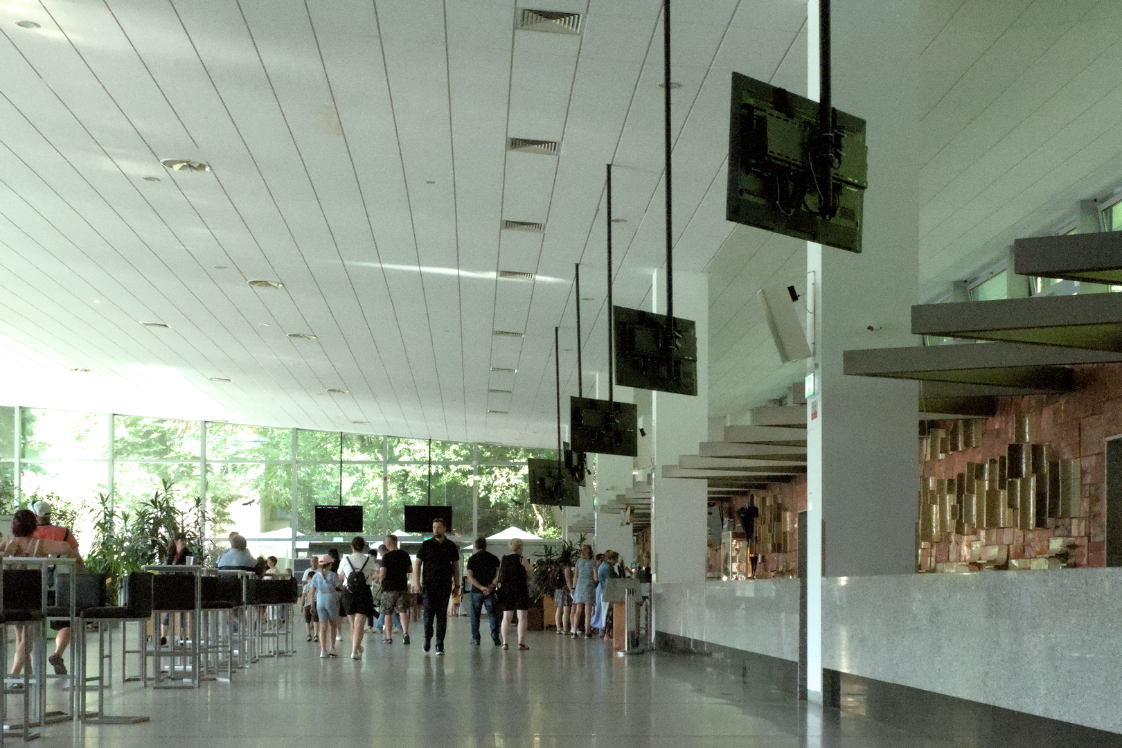 Na wejściu do Pijalni Głównej przywitały mnie ustawione bramki wejściowe, zazwyczaj otwarte na oścież nie stanowiły żadnej przeszkody. Pierwszym silnym doświadczeniem jest widok ściany bujnej roślinności oraz nagłe uderzenie ciepła. W przestronnym wnętrzu rosną tropikalne palmy, paprocie i monstery, które wymagają szczególnych warunków. W środku jest trochę duszno, ale dzięki tej zieleni monumentalna hala staje się bardziej przytulna. Po pokonaniu schodów ukazuje się główna atrakcja — rozległa część pijalniana z niziutkimi stolikami i kanapami, które sprowadzają człowieka do poziomu parteru.