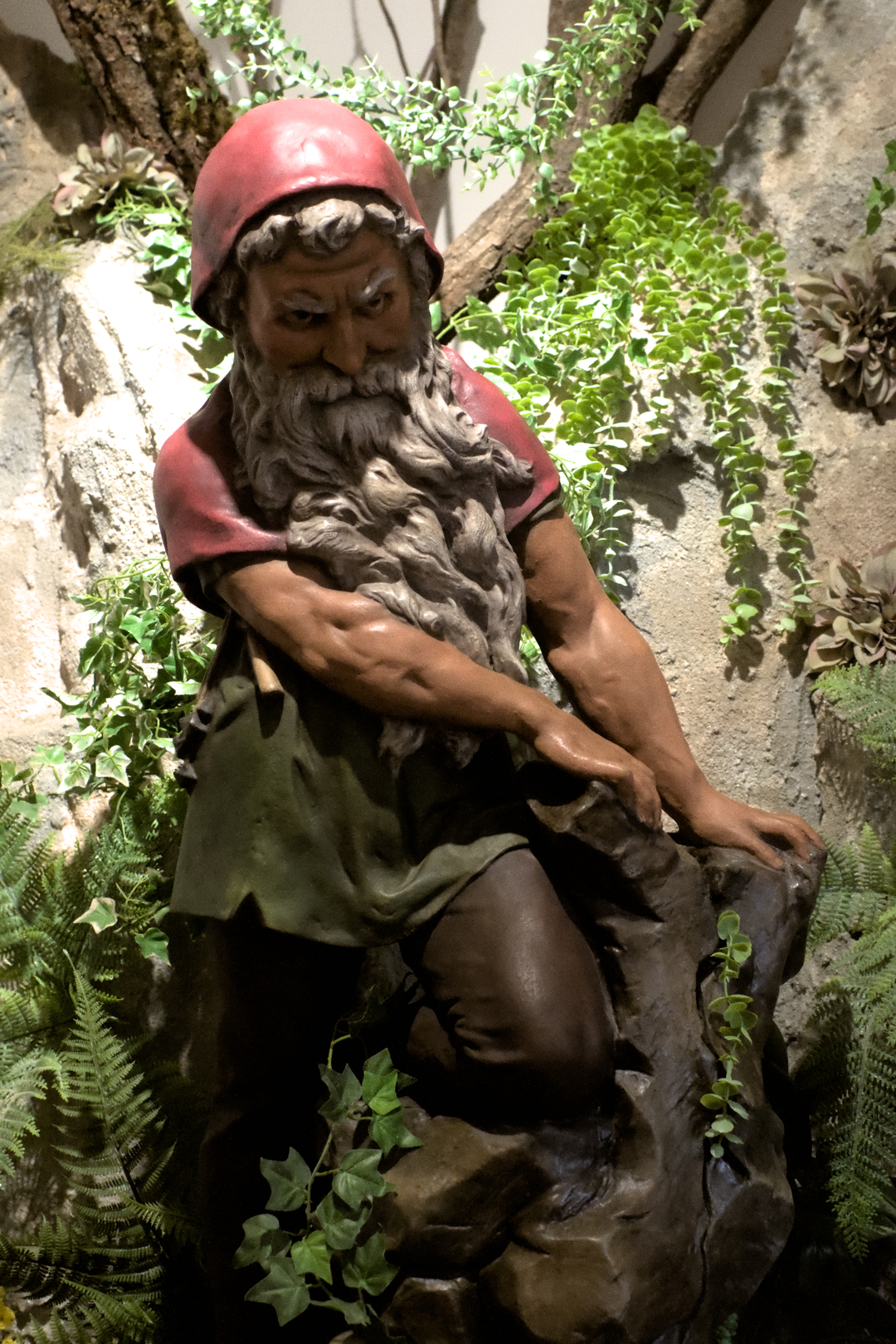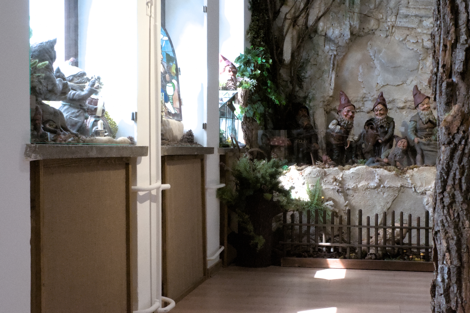 Po pokonaniu schodków na pierwsze piętro, zignorowaniu drogowskazów do sal zabiegowych (Stare Łazienki to przede wszystkim budynek uzdrowiskowy) i pokonaniu tajemniczych drzwi wchodzimy do innego świata, jak z baśni. Przede wszystkim gnomy, gnomy i jeszcze raz gnomy, gdzie okiem tylko sięgnąć. Typowo ogrodowe, ceramiczne, szklane, te większe i wręcz miniaturowe. Sprawiały wrażenie, że raczej zajmują się sobą i swoimi zajęciami. Grały sobie w karty, pilnowały kuferków ze skarbami, zagrabiały listowie, doglądały ogródka. Niektóre z nich obserwowały nas jednak w bardzo sugestywny sposób, jakby knuły. Prawdopodobnie planowały jak nas tu zatrzymać. Właściciel wystawcy na wejściu coś mówił o założeniu sobie czapek na głowę… może tak właśnie pozyskują te krasnale? Błądzisz po tych pomieszczeniach, wpatrując się w te figurki, aż w końcu wyrasta Ci broda, zakładasz czerwoną czapkę i sam wskakujesz do gabloty?