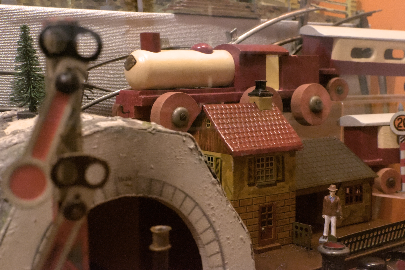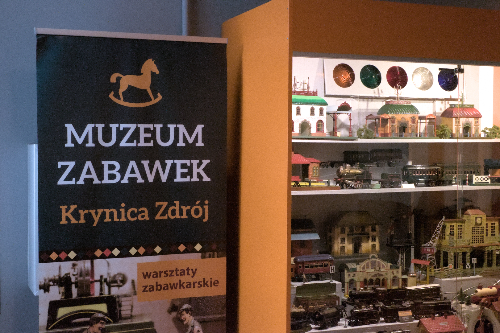 Muzeum na początek serwuje nam bogatą wystawkę kolejarską. Z półek witają nas tabory ze wschodnich Niemiec lub Czechosłowacji, zestawy do montowania torów, zabawki parowe skłaniające do eksperymentów. Sporą część ekspozycji zajmuje też interaktywna diorama, przedstawiająca zelektryfikowane górskie miasteczko. Po walnięciu łapą w wielki, płaski przycisk na ścianie zapalają się wszystkie światełka, a pociąg PKP Cargo rusza czym prędzej i przez kilkadziesiąt sekund żwawo pomyka wokół komina. Obserwacja kolejki tak mnie pochłonęła, że zapomniałem o jej sensownym ujęciu. Wiedzcie jednak, że ona tam jest i wciąga.