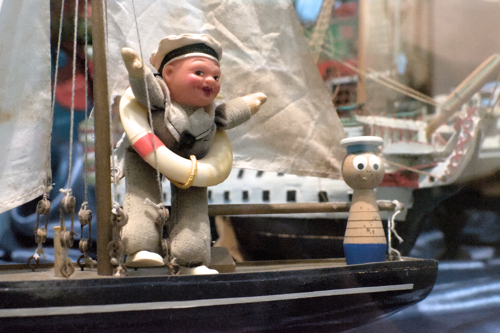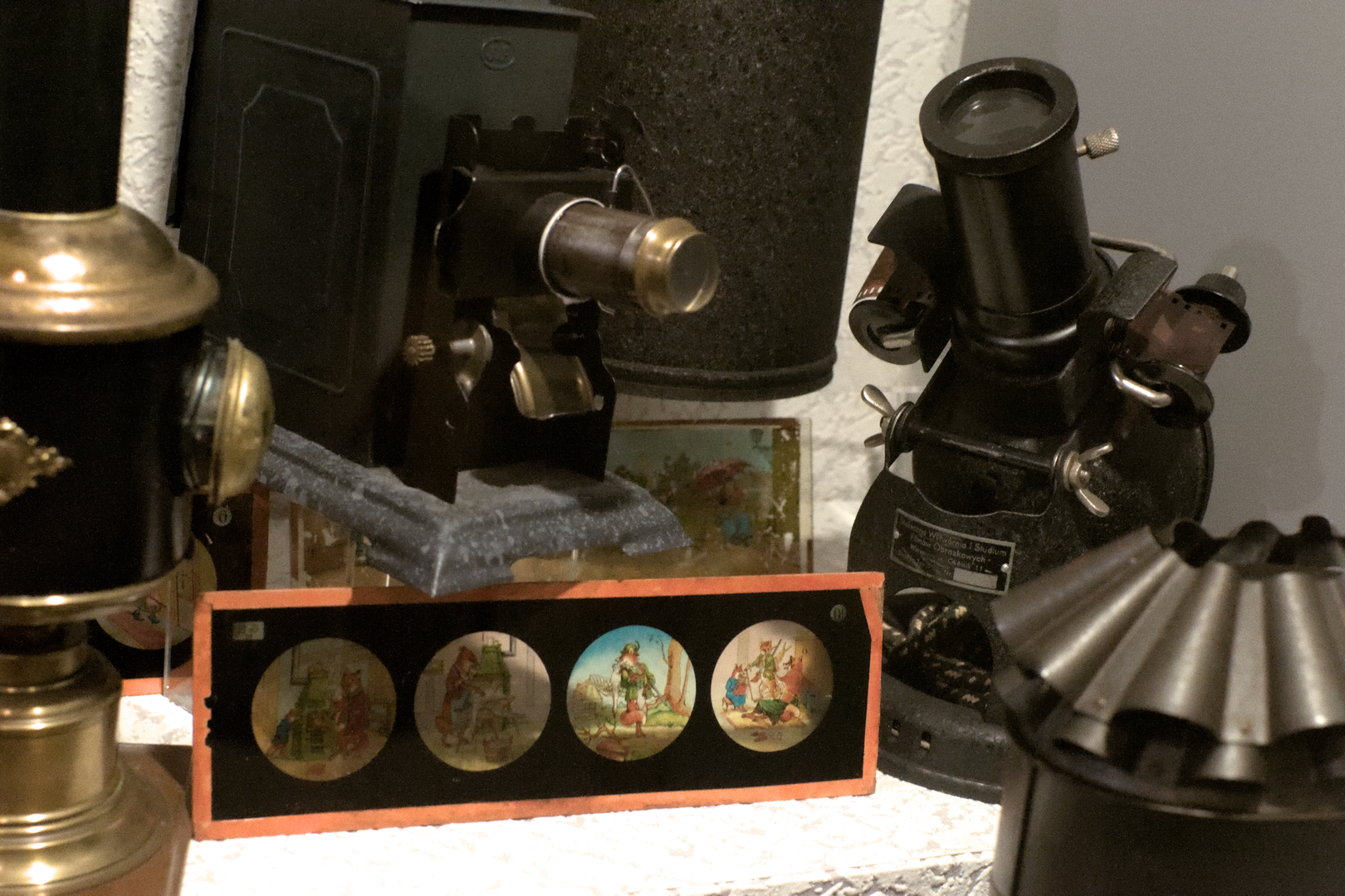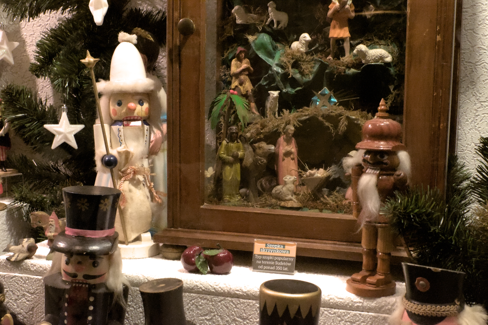 Jak sięgam pamięcią, kolejki zazwyczaj pojawiały się pod choinką bożonarodzeniową, obok żołnierzyków, gier planszowych, samochodzików, samolotów, lalek i wielu innych świątecznych prezentów, zazwyczaj stłoczone wokół stajenki betlejemskiej. To właśnie im została poświęcona kolejna sekcja, która wydała mi się szczególnie ciepła i pełna nostalgii. Przeniosła mnie w świat, który jeszcze jestem w stanie przywołać w pamięci. Tradycyjne święta, kolędy, świeczki, bombki, anielskie włosy, zaspy śnieżne za oknem i zapach mrozu zmieszany z nutą węgla. W gablocie znalazły się zarówno zabytkowe egzemplarze szopek, ale nie tylko. Jedna z nich, złocona Szopka Krakowska została stosunkowo niedawno, bo w 2000 roku. Jak głosi notka, ofiarował ją miejscowy ksiądz proboszcz z okolicznej parafii grekokatolickiej. Szopkom towarzyszyły teatrzyki marionetkowe, kukiełki, znalazły się też zabytkowe projektory slajdów (w tym niegdyś kultowa “Bajka”).