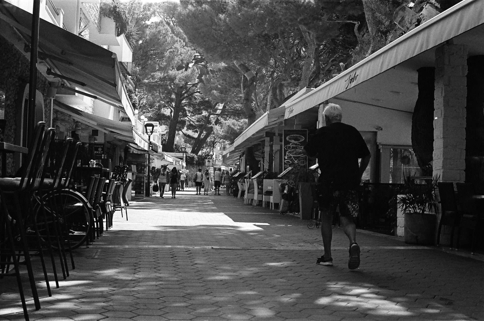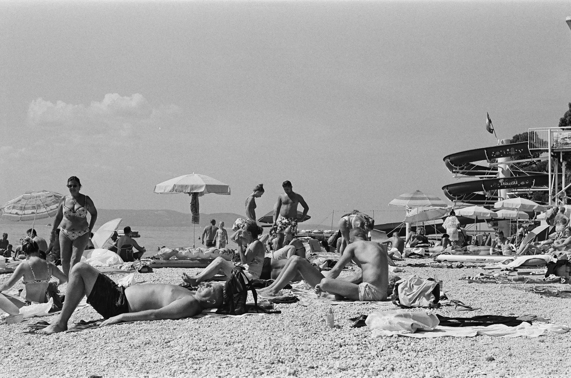 Podobno nie jest dobrym pomysłem, aby wychodzić na zdjęcia w środku dnia – ktoś powie, słońce za ostre, albo zupa za słona. Osobiście uważam, że jest to bzdura (jak pamiętamy, jestem ignorantem, który nie zna się na technikaliach – można mnie pełnoprawnie skrytykować w tym miejscu) i każda pora (jeśli mamy źródło światła) jest dobra na zdjęcia, trzeba tylko dostosować się do zastanych warunków. Owszem, ciężko byłoby silić się na porządny portret przy tym świetle, ale mocne kontrasty akurat świetnie zagrały na czarnobiałym filmie uwypuklając sylwetki ludzi. Trudno wyobrazić sobie śródziemnomorską plażę bez ostrego słońca.