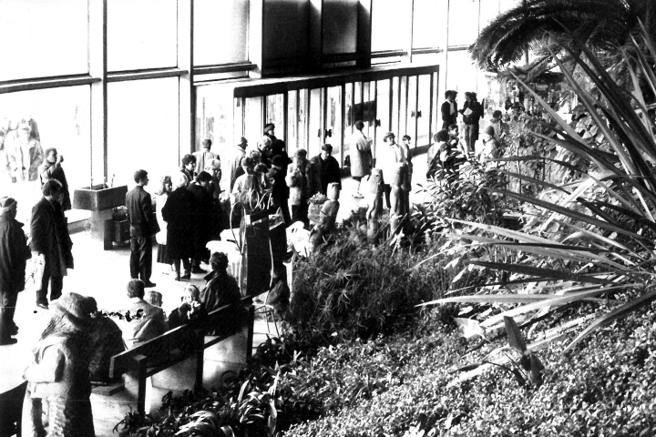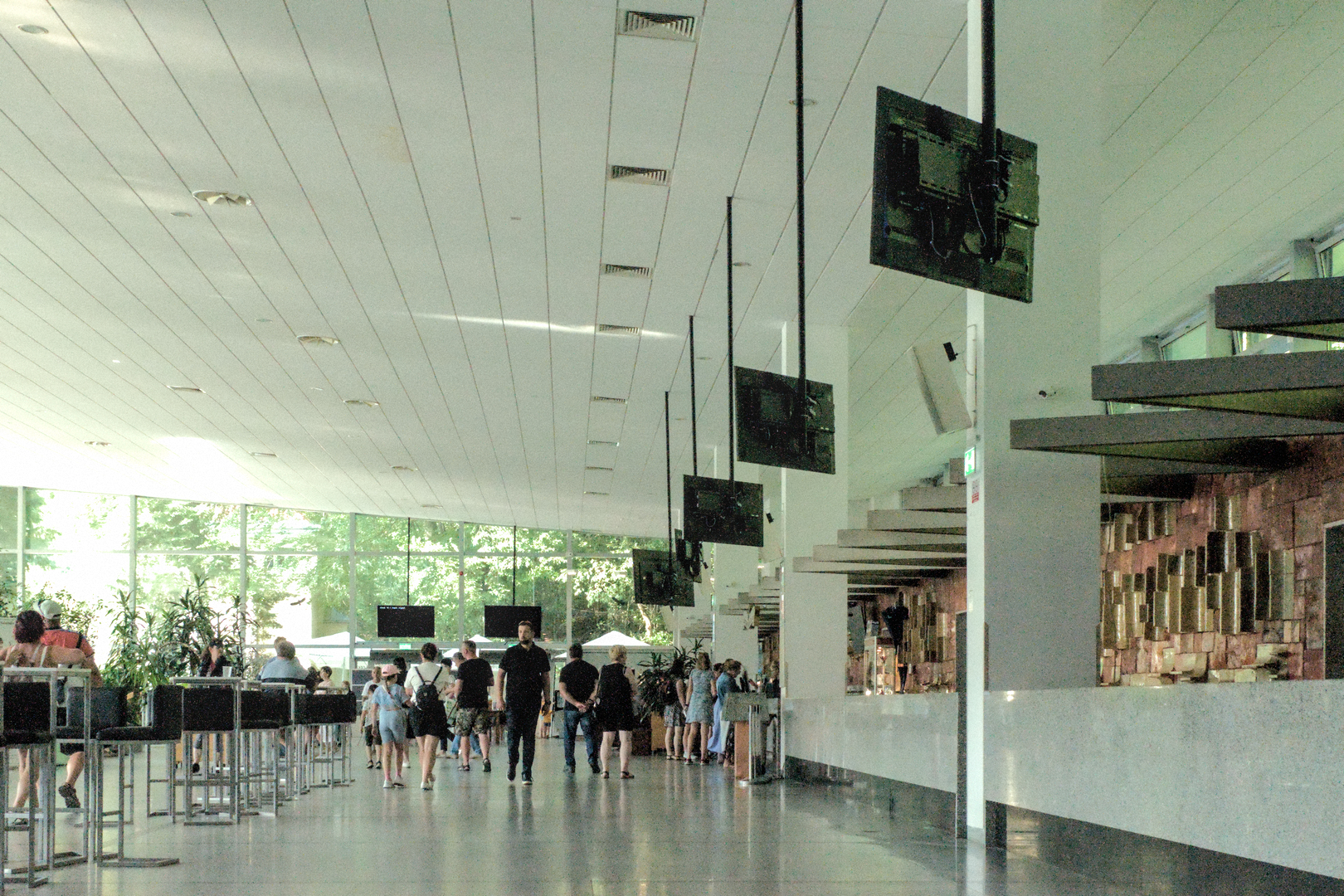 Na wejściu do Pijalni Głównej przywitały mnie ustawione bramki wejściowe, zazwyczaj otwarte na oścież nie stanowiły żadnej przeszkody. Pierwszym silnym doświadczeniem jest widok ściany bujnej roślinności oraz nagłe uderzenie ciepła. W przestronnym wnętrzu rosną tropikalne palmy, paprocie i monstery, które wymagają szczególnych warunków. W środku jest trochę duszno, ale dzięki tej zieleni monumentalna hala staje się bardziej przytulna. Po pokonaniu schodów ukazuje się główna atrakcja — rozległa część pijalniana z niziutkimi stolikami i kanapami, które sprowadzają człowieka do poziomu parteru.