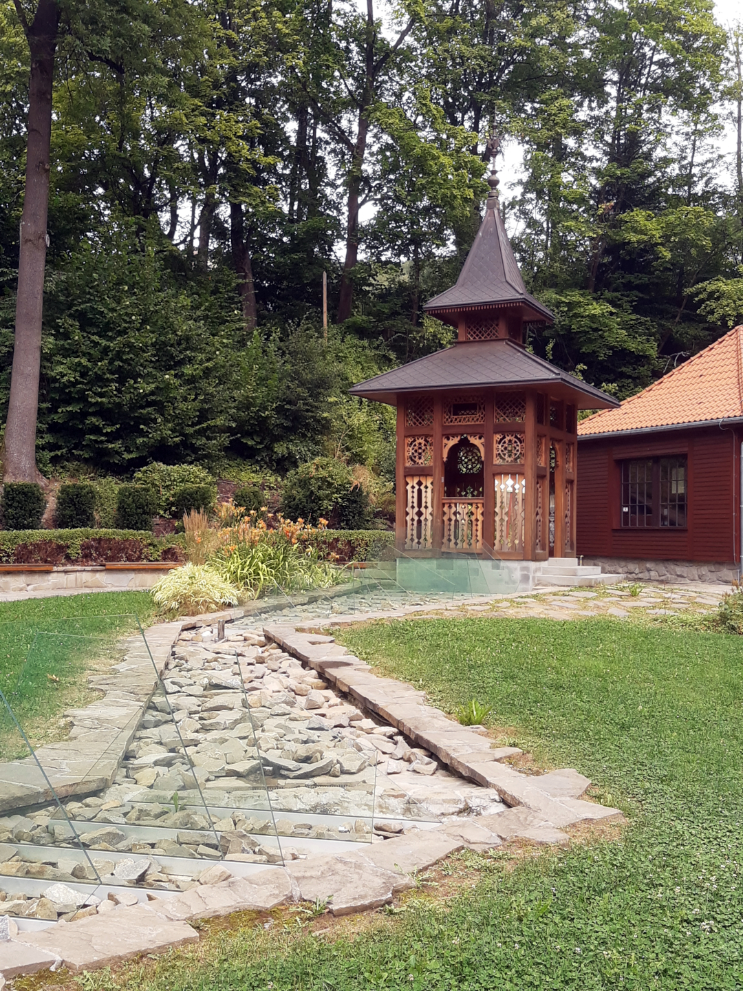 Warto cofnąć się jeszcze w stronę stacji dolnej kolejki na Górę Parkową. Jeżeli miniemy Amfiteatr Krynicki (którego, wstyd się przyznać, w żaden sposób nie uchwyciłem. To tam odbywa się od lat Festiwal im. Jana Kiepury) w końcu dojdziemy do położonej na uboczu Pijalni Jana. Po drodze mijamy oczywiście przywołane Cristalpatio.